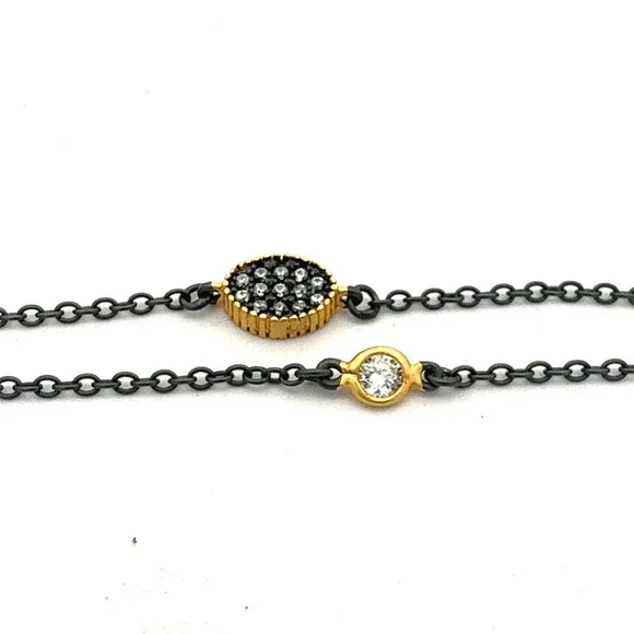 * Freida Rothman Rhodium 14K Pltd Sterling Silver Cubic Zirconia Station Necklace* Length: 40"* Width: 1/16" to 3/8"* Six (6) Cubic Zirconia rounds measure approximately 2.5 mm each* Sixty-six (66) Cubic Zirconia rounds measure approximately 1 mm each* Weight: 8.8 tgw* Marked: FR * MAKER´S MARK * 925* Fastening: Lobster claw* Condition: As pictured. New With Tags.* 5% Restocking Fee.* CN107