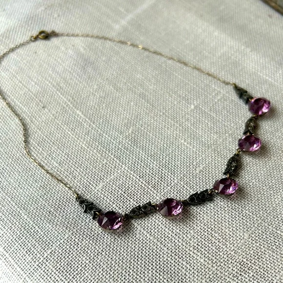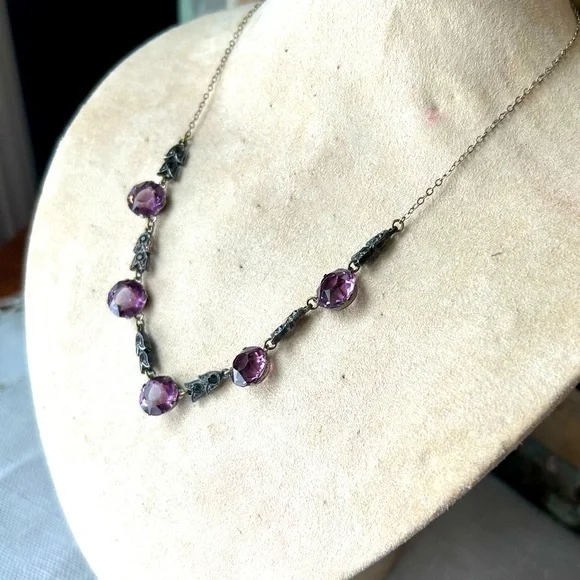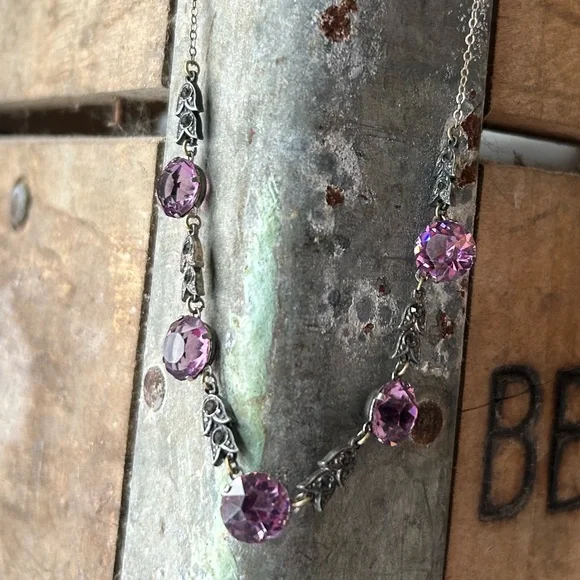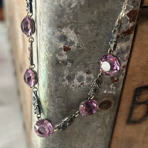 Authentic early 1900’s Antique Sterling with Old European Cut purple crystals. Large size crystals hand cut with an open back allowing more light through. Very tasteful, feminine, and elegant. -15inches