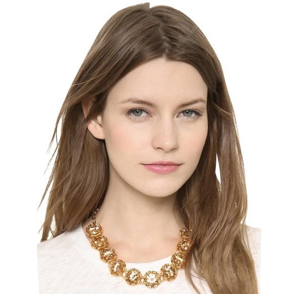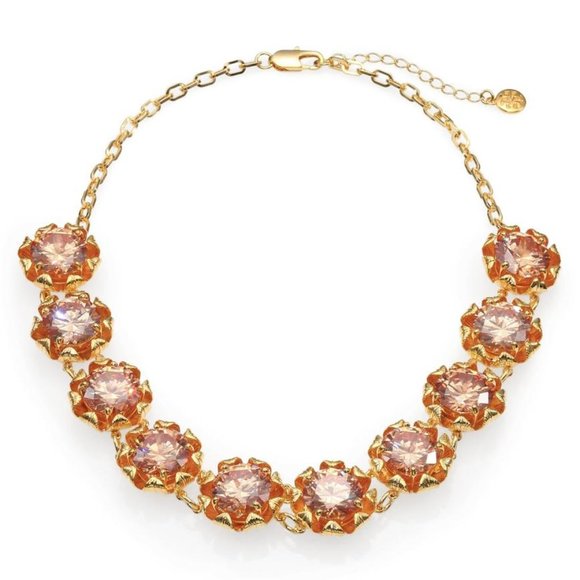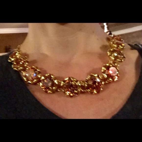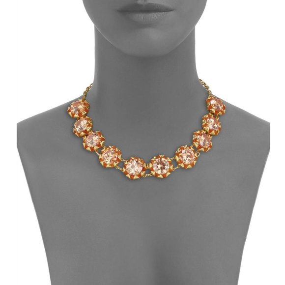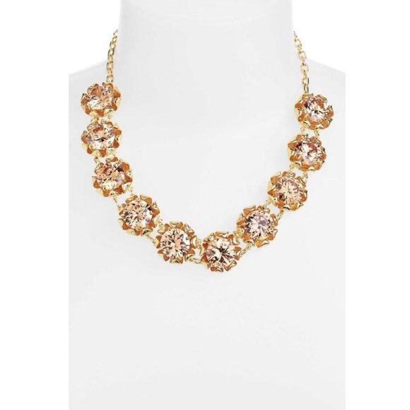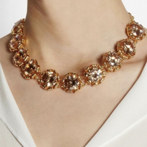 BRAND NEW without tags."Anchored by a gilded chain, vintage-inspired blooms engulf sparkling glass stones. Dazzling crystals sparkle amidst gleaming floral settings along the front of an eye-catching necklace."- 15 1/2" length; 2 1/2" extender; 1" diameter crystals.- Lobster clasp closure.- 16k-gold plate/glass.- Retail $350 plus tax.