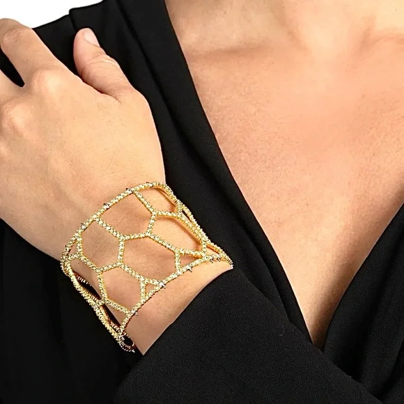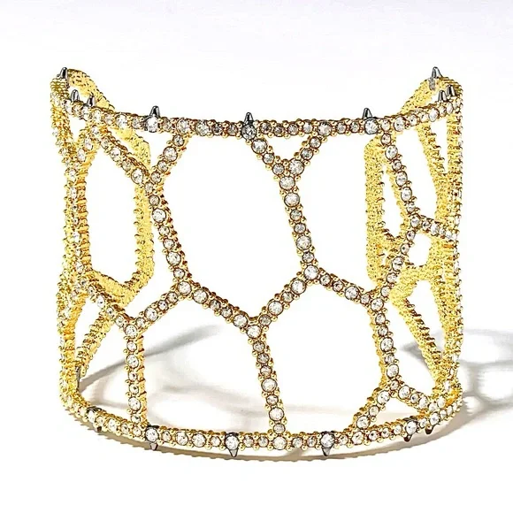 Stylish cuff with honeycomb design. Features 14k gold and ruthenium plated metal with crystals and gunmetal tone spikes. Adds elegance to any outfit. Slightly adjustable....