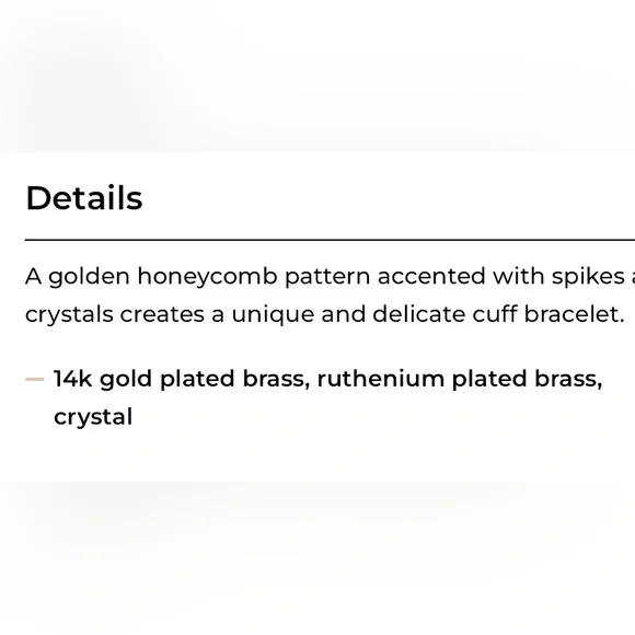 Stylish cuff with honeycomb design. Features 14k gold and ruthenium plated metal with crystals and gunmetal tone spikes. Adds elegance to any outfit. Slightly adjustable. (Ruthenium is a rare transition metal belonging to the platinum group of the periodic table.)NWT, hard to find, no flaws. No longer available on the website.Photos of bracelet available by request.
