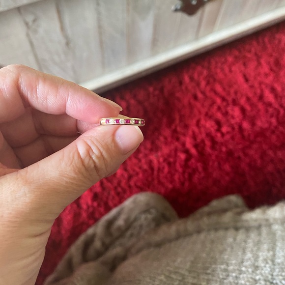 Gold band with Diamonds and Garnets barely worn. Approximately size 6.