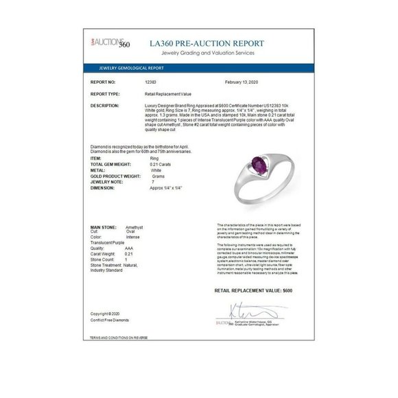 OFFERS WELCOME!APPRAISED AT $600, appraiser´s report included.With a delightful hint of a heart shape, this Amethyst ring is perfect for anniversary, Valentine´s Day, or any heartfelt occasion.And, it´s February´s birthstone.10k white gold (stamped 10k).Purple color with AAA quality oval shape cut Amethyst.Includes gift and display boxes, and glossy appraiser´s report.