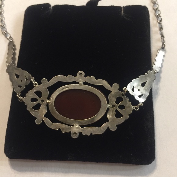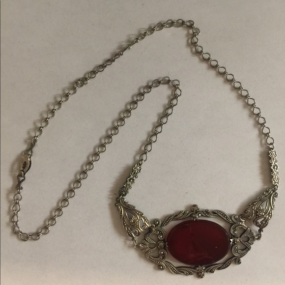 •Sterling Silver Art Nouveau Carnelian Marcasite Pendant•Dimensions: Necklace 16”L•Oval Carnelian Stone approx. 24mm x 18mm