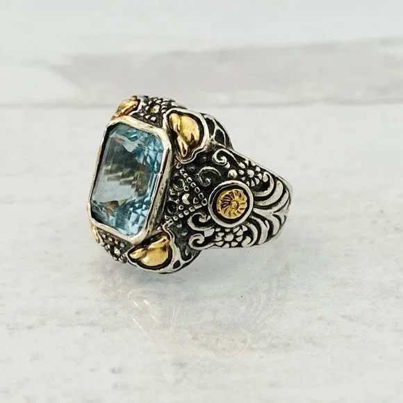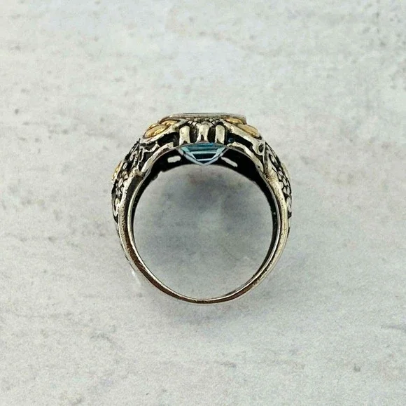 Fashioned in solid sterling silver with applied 18k gold accents, this ring is set with a gorgeous genuine emerald cut Swiss blue topaz gem. There are marcasites above and below the main stone. The shoulders are carved in an intricate scroll pattern. The setting measures 3/4" or 19mm north-south. The east-west measurement for the bezel setting is approximately 11/16" or 17mm. The lovely baby blue topaz is estimated to measure 12mm by 10mm by 8mm, or approximately 8 carats. This stunning ring is size 6.75. It weighs approximately 7.6 gramsIt is marked 925 and 18k. There is a maker´s mark that resembles Krementz Jewelry´s newer marks. It is difficult to see.Overall condition is very good. There are areas on the ring shoulders that might have lost the marcasites. It is not uncommon and does not detract from its beauty. Topaz is the birthstone for the month of November. Although it looks like a Belle Epoque Period ring, it is likely a period revival made in the 1980s. Gorgeous, just the same! Please see the photos for details and email us any questions. Sold as is.Thank you for your interest! 8115