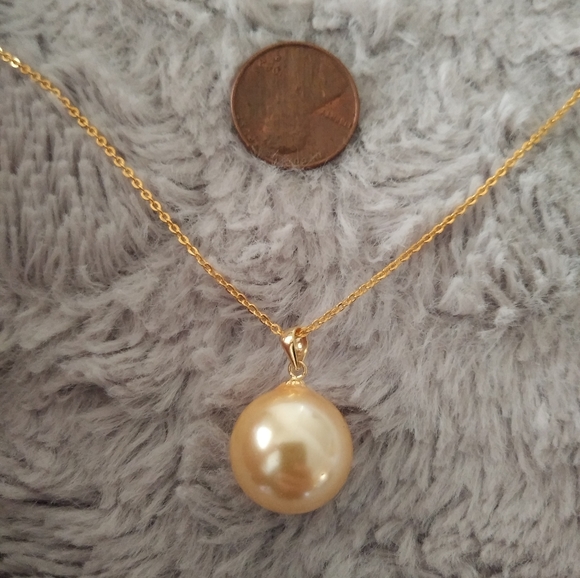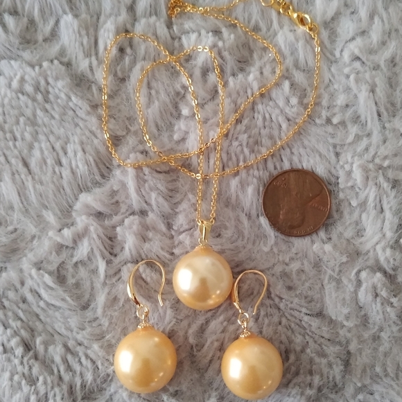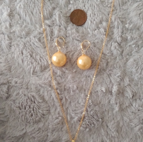 Estate 16mm large golden pearl pendant necklace + dangle drop earrings set!The chain + metal parts are 14k gold finish over sterling silverThe pearl on the pendant is slightly...