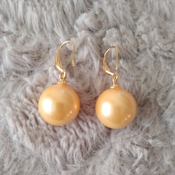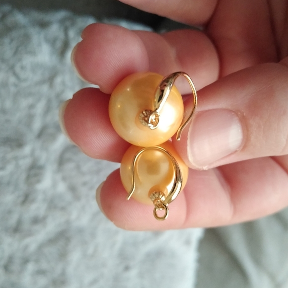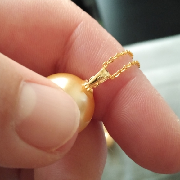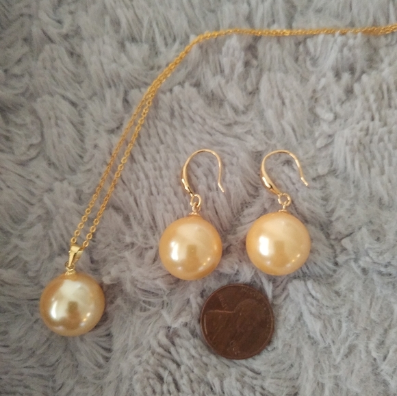 Estate 16mm large golden pearl pendant necklace + dangle drop earrings set!The chain + metal parts are 14k gold finish over sterling silverThe pearl on the pendant is slightly lighter then the earrings but match almost perfectlythese pearls are round, large, have great luster & shineThe chain + pendant are hallmarked 925The earrings stamp has faded, both are 14k over silverI don´t know what type of pearls these are they are vintageGreat shape! Comes with a boxPRICE FIRM UNLESS BUNDLED!