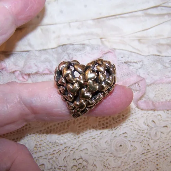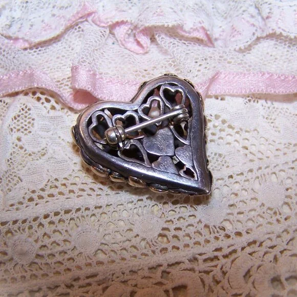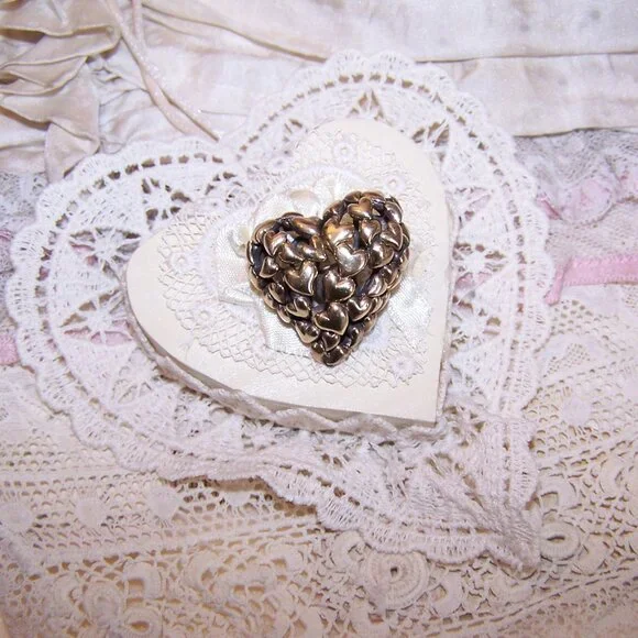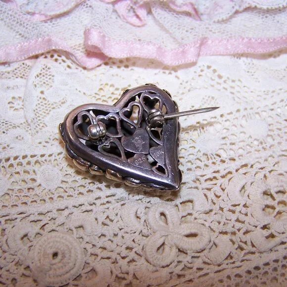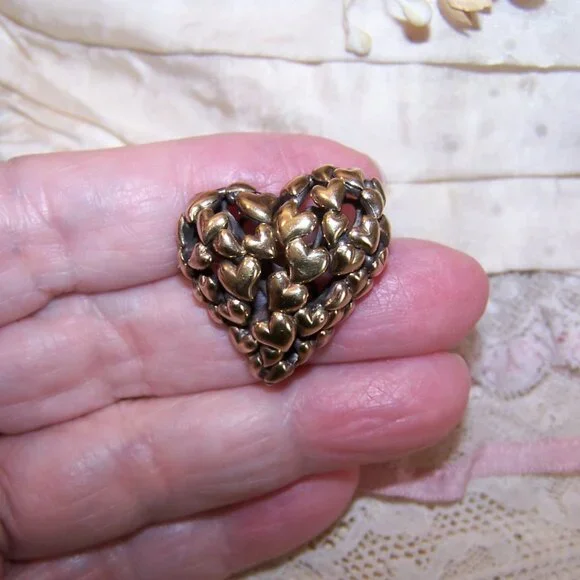 From John Hardy, here´s a Sterling Silver (hallmarked as pictured) and 18K Yellow Gold pin / brooch in the shape of a witches heart. The top design features a swirl of hearts covered in a layer of yellow gold. Size is 1" high x 1" wide; depth is about 5/16". Weight is 9.8 grams. Safety catch to hold the pinstem in place. In looking on the Internet, it appears that this Hardy design was an exclusive to one of the major department stores and sold out almost immediately so finding even a single piece is a rare find. It is absolutely adorable!7734RV/B