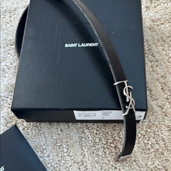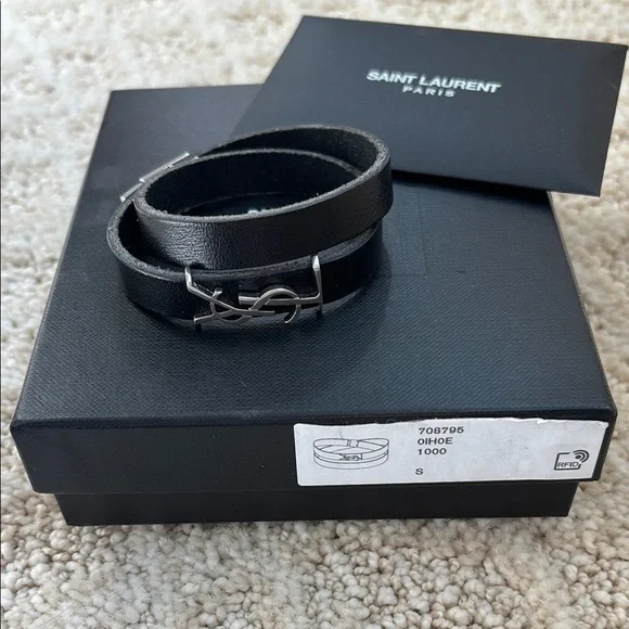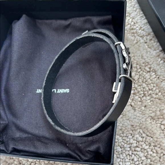 Elevate your style with the Saint Laurent black leather double wrap bracelet. Crafted for sophistication and durability, this bracelet is perfect for any occasion. Comes with box...