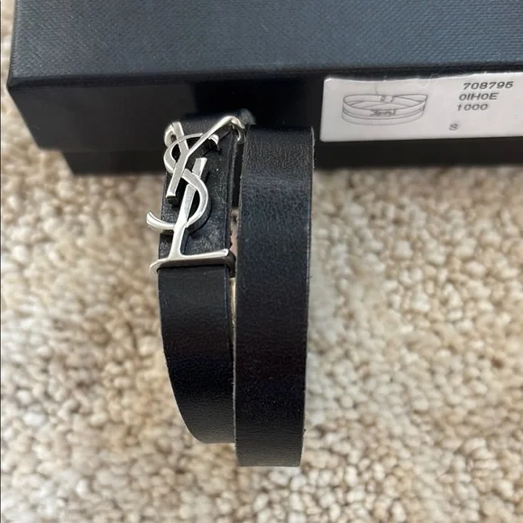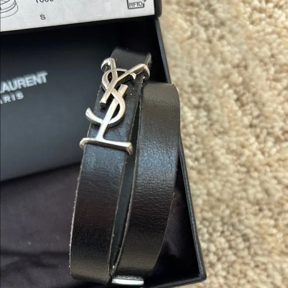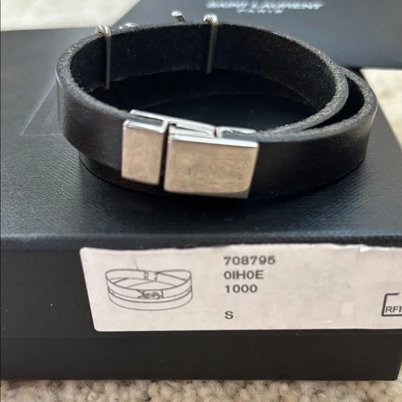 Elevate your style with the Saint Laurent black leather double wrap bracelet. Crafted for sophistication and durability, this bracelet is perfect for any occasion. Comes with box and dust bag Double-wrap bracelet by Saint Laurent.• Black calfskin leather double-wrap band.• Silvertone YSL logo and hardware.• Wraparound style; clip closure.• Made in Italy