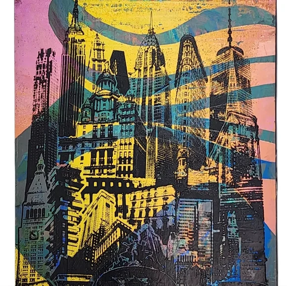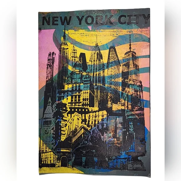 1/1, ´The Thongo´ Monoprint Poster by Gladiator Art & Apparel. 19” x 13” Multi-colored, including shades of gray, pink, orange, yellow, black, and, more. This unique Poster is layered with, acrylic paint and original hand-screen-printed graphics with our ‘NYC Skyline’ graphic in black ink.This piece features the city´s most recognizable landmarks, from the Empire State Building to the Chrysler Building. The stark contrast between the city´s towering structures and the blank space of the sky creates a dramatic and eye-catching effect.This print is perfect for anyone who loves New York City or wants to add a touch of urban style to their home. It would also make a great gift for any occasion.*The print is made of high-quality acid free paper and is signed by the artist.** It is shipped flat and ready to frame. ***frames are not included. ****Colors may vary due to lighting.*****I accept offers and bundles. Please feel free to leave any comments or questions.Thank you