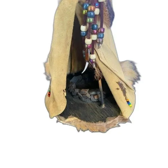 Discover a stunning piece of artistry with this vintage 1996 handmade leather and fur teepee, crafted by the talented Native American artist Ginger Chaves of "Whispering Wolf." Standing at 20 inches tall with a 7-inch diameter base, this exquisite display showcases intricate details, including authentic materials and a signed interior. Perfect for collectors and enthusiasts alike, this teepee embodies cultural heritage and craftsmanship, making it a captivating addition to any home decor. Made in Colorado