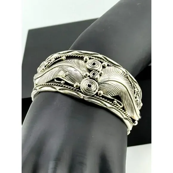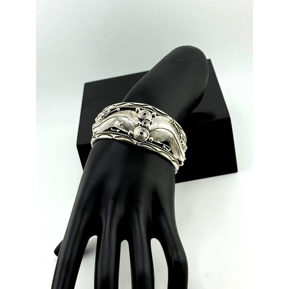 Beautiful Navajo bracelet Cuff measuring approx. 7" and inside 2.3".Stamped "Sterling" and "DM", a well known Navajo silversmith.Gorgeous engravings of feathers and other round swirls. Weighs 50.6g.