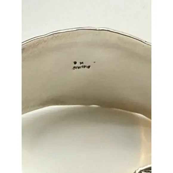 Beautiful Navajo bracelet Cuff measuring approx. 7" and inside 2.3".Stamped "Sterling" and "DM", a well known Navajo silversmith.Gorgeous engravings of feathers and other round...