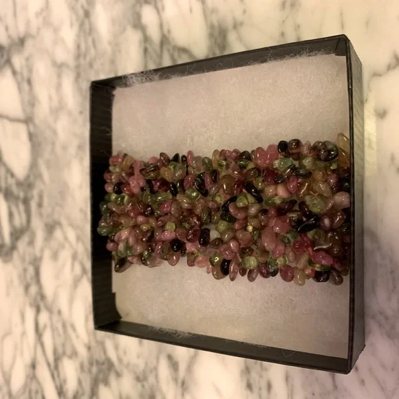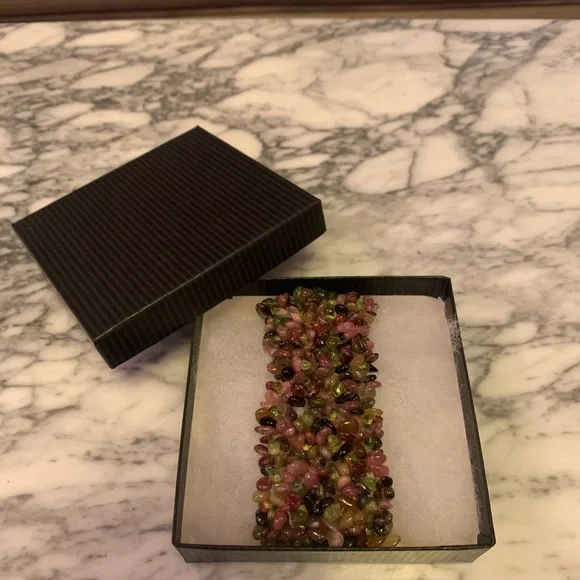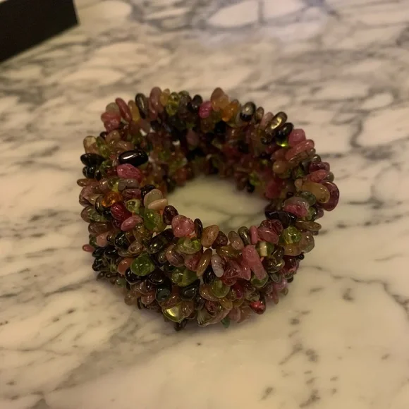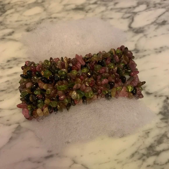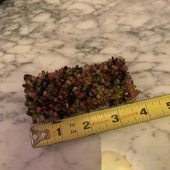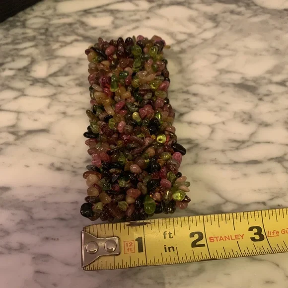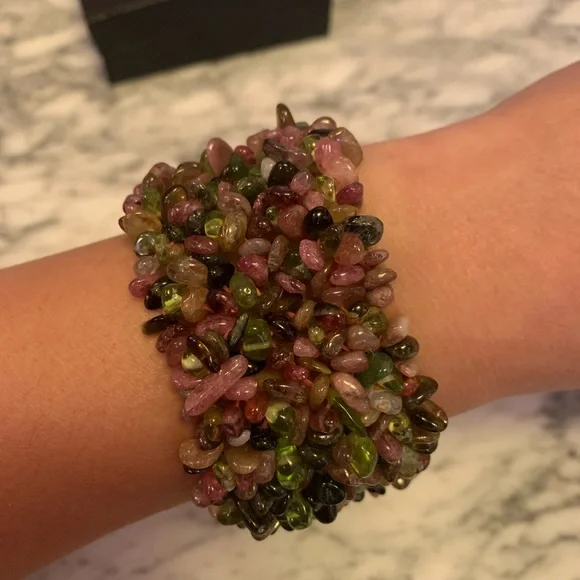 Guaranteed all genuine natural Tourmalines!!!! Beautiful colors!Note these are natural gems so they have natural tones and “blemishes”.Stunning wide piece.Hard to find genuine tourmaline bracelets in this wide as it takes a lot to make this bracelet.Handmade with elastic band.Gorgeous piece from my jewelry collection! Don’t miss it! Approx 92 grams!This item may not bundle for discount. All sales final