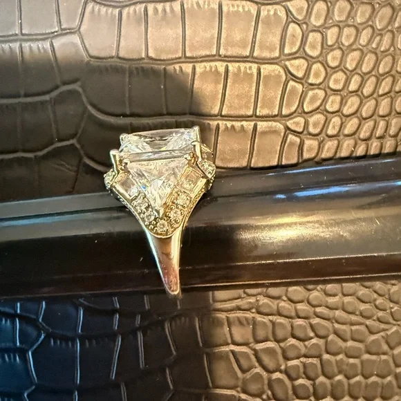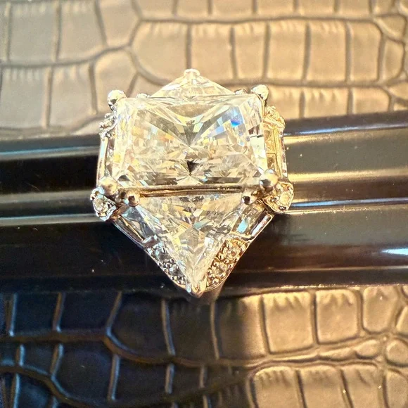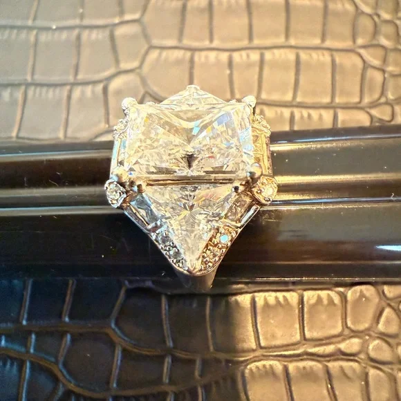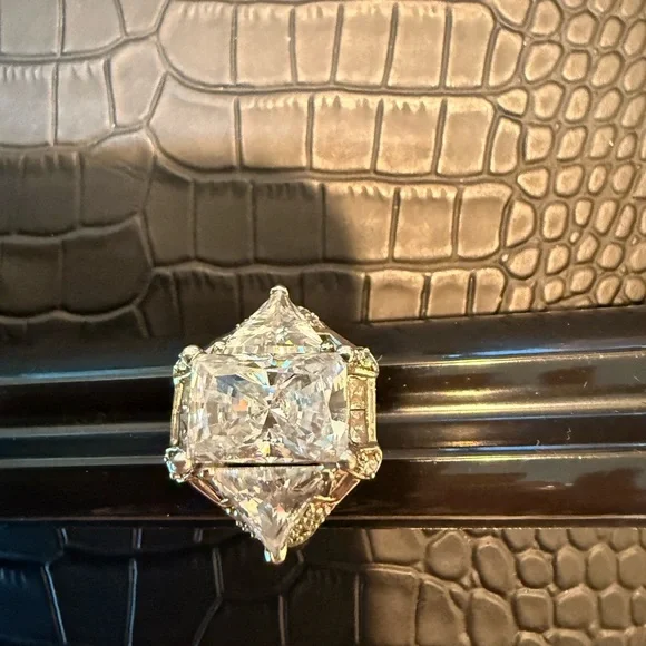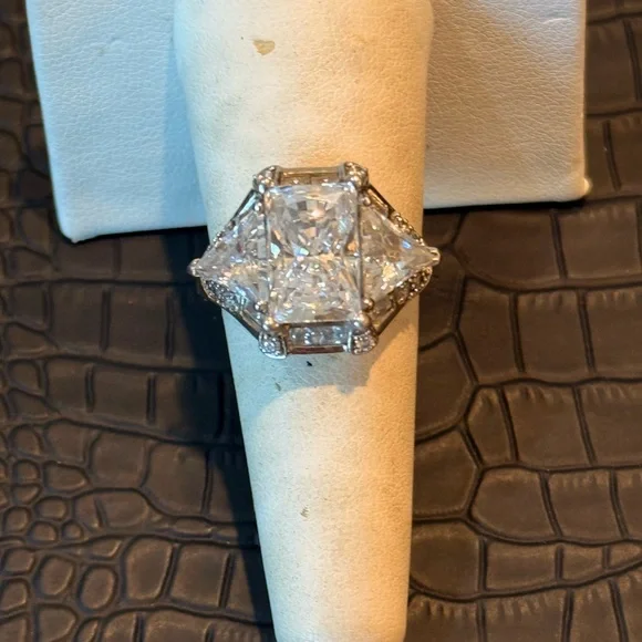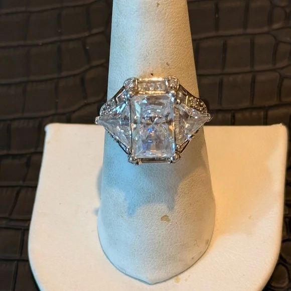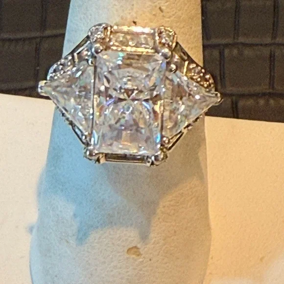 Masterpiece! Emerald cut solitaire adorned with simulated trillion cut stones, set in platinum over precious sterling silver.925.This beauty will not fade nor lose its color, can...
