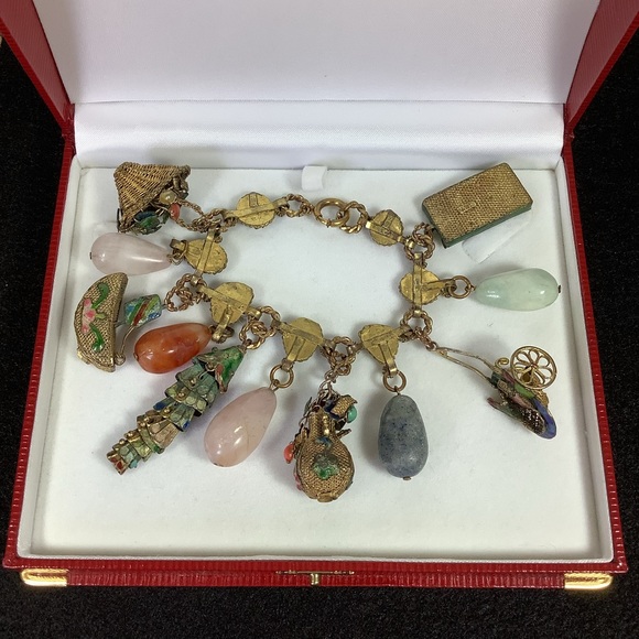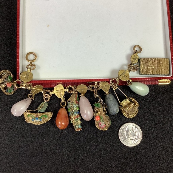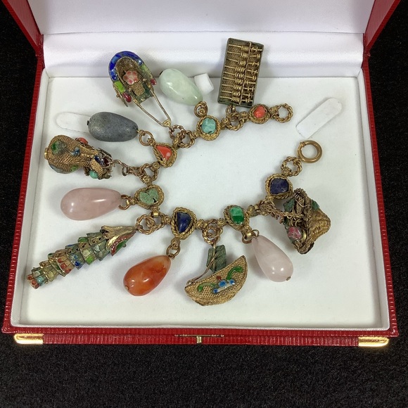 Antique Chinese export filigree charm bracelet.Antique 40’SGemstone: rose quartz.jade .red agate .coral .lapis.Bracelet size: 7 inch Charm size : 1 inch 1.5 inch 2 inch Red box...