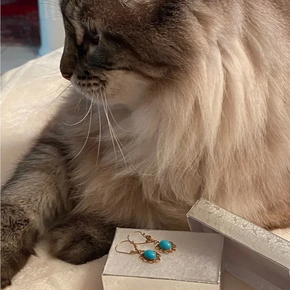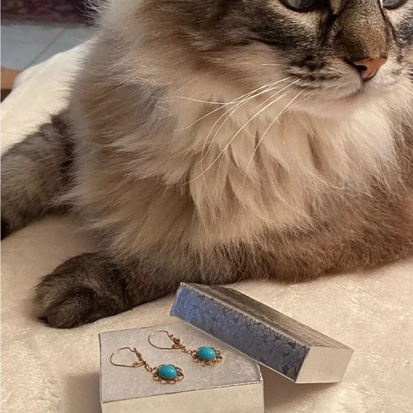 Vintage Turquoise( 2.50ct , 1.25ct each earrings ) Solid 10k yellow gold dangle earrings, size 1.75” x 0.50” , total weight 2.2gr. Tested positive for 10k gold.