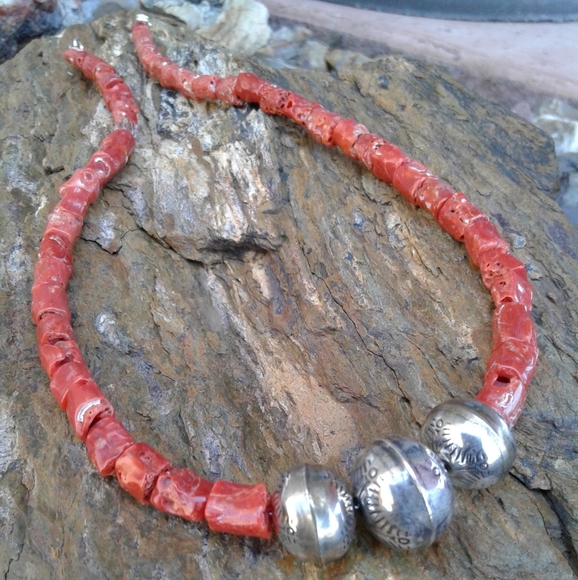 Sterling Silver Genuine Red Mediterranean Coral Beaded necklace with Vintage Sterling Accent beads...length is 18", Sterling lobster claw clasp...
