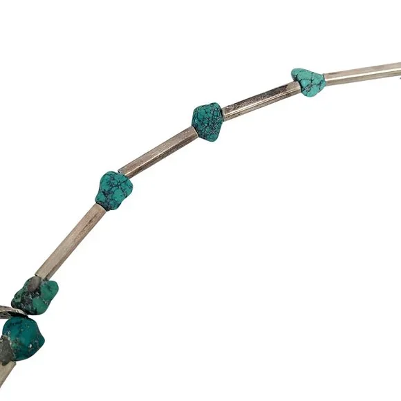 Silver and turquoise bead necklace.This necklace features long silver barrel beads with turquoise beads and hammered silver teardrop dangles.Measures approx 26 1/2" long, dangles...
