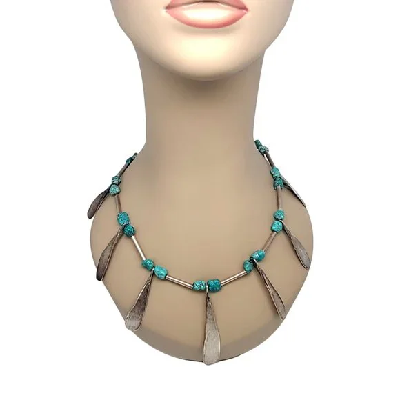 Silver and turquoise bead necklace.This necklace features long silver barrel beads with turquoise beads and hammered silver teardrop dangles.Measures approx 26 1/2" long, dangles measure approx 2 7/8" to 1 1/2" long.Weighs approx 94.9g, 61.0dwt.No mark, tested for silver. File marks on 1 dangle from silver testing (see photo).Very nice condition with some slight surface scratching and tarnish.Will come packaged in a gift box or pouch (when possible) and will be shipped US Priority Mail with insurance.CL051822/17KCS