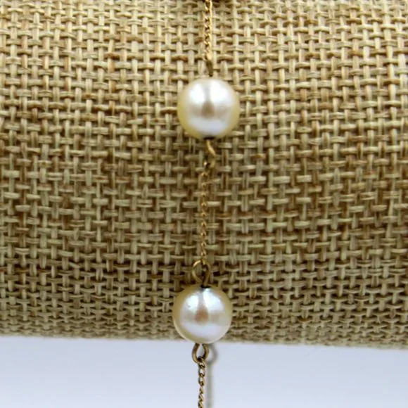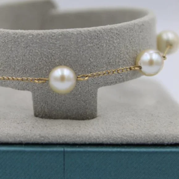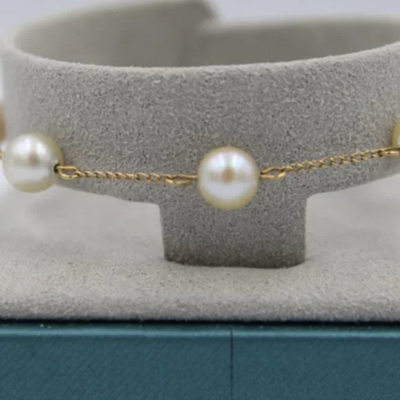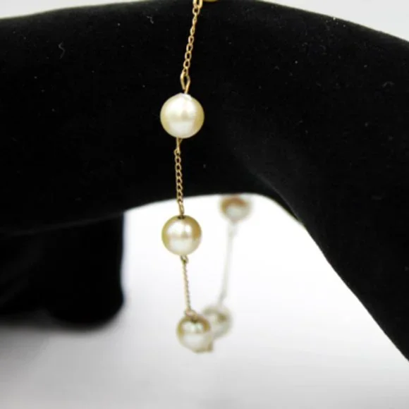 This beautiful 14K yellow gold station bracelet is comprised of genuine round cultured pearls with 14k yellow gold links between each pearl stone in the bracelet. It is a stunning...