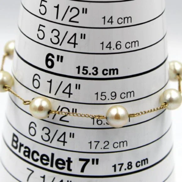 This beautiful 14K yellow gold station bracelet is comprised of genuine round cultured pearls with 14k yellow gold links between each pearl stone in the bracelet. It is a stunning piece of fine jewelry. The bracelet features seven cultured pearls that are Ivory in color. Each round pearl approximately measures 7.5 mm long X 7.5 mm wide X 7.5 mm in depth. Each cultured pearl is approximately 2.5 carats. The approximate total carat weight of the seven pearls is 17.5 carats. The 14K yellow gold links are attached to each pearl in the bracelet. Each link is approximately 2.25 mm wide.On the shown bracelet measurement tool it is approximately 6 1/2 in length. When the bracelet is lying flat, it approximately measures 7 inches. The 14K yellow gold links and clasp tested 14K using a Presidium gold tester. The 14K yellow gold clasp is marked "14K".The gram weight of the bracelet is approximately 3.8 grams.This is a new unworn item. This item is in excellent overall condition. Please refer to the pictures concerning the description and condition of this item.