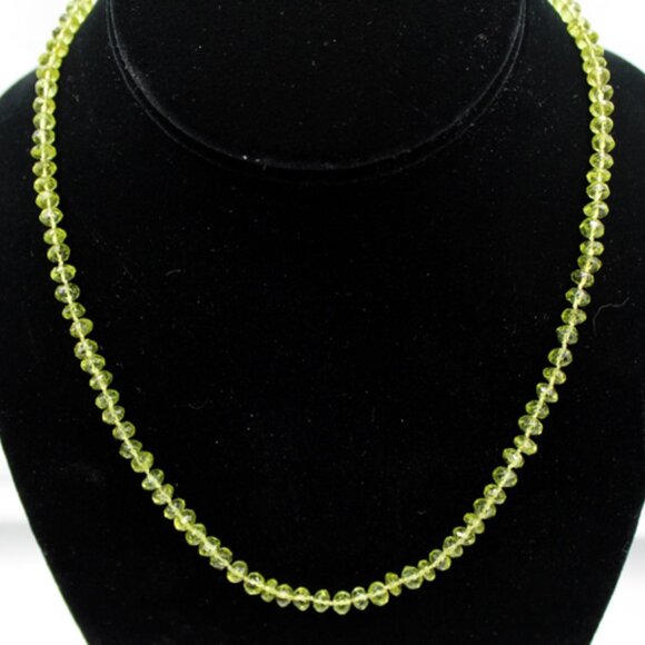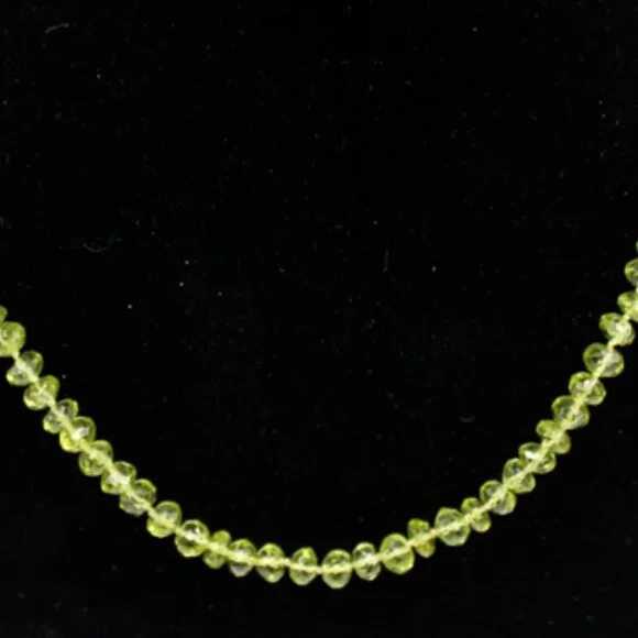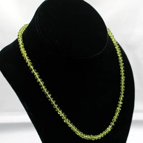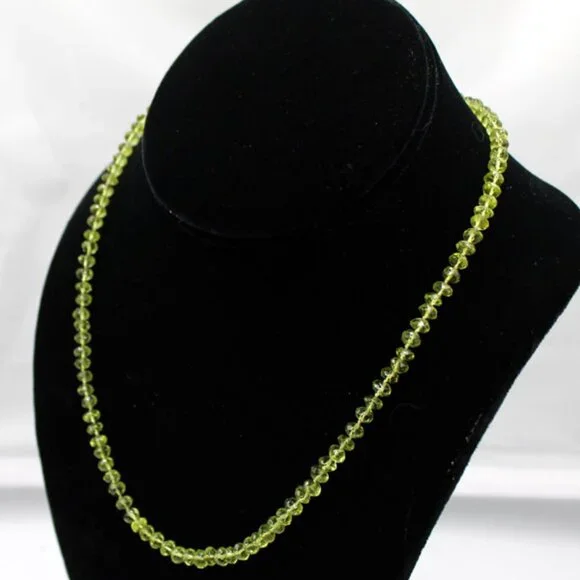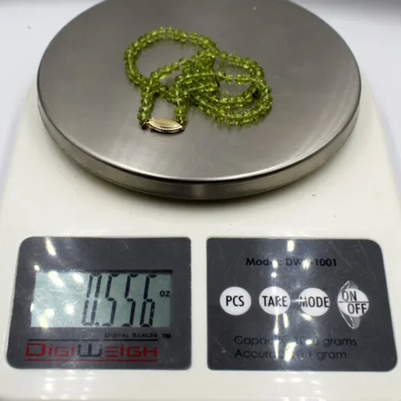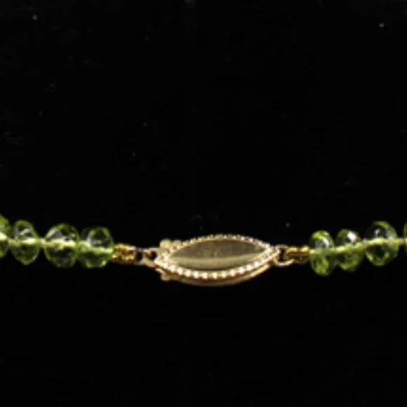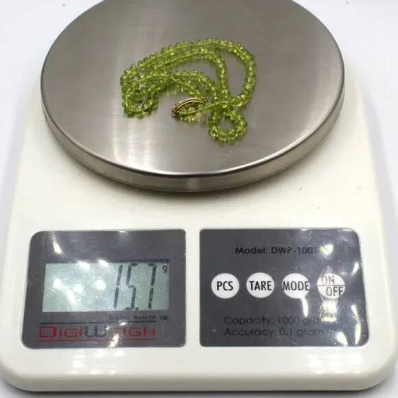 his beautiful NWT and unworn 14K yellow gold beaded light green translucent jade necklace is a stunning piece of fine jewelry. It has an MSRP listed price of $650. It is on sale during this holiday season in mystore.The necklace features 112 faceted oval light green translucent jade stones strung together on fine clear silk with an approximate total carat weight of 22.40 carats.Each jade stone is faceted and oval shaped and approximately 3.20 mm X 4.90 mm X 4.95 mm or .20 ct each.The 14K yellow gold clasp is a lobster clasp with a yellow gold tongue. The tongue is stamped "14K".The clasp is approximately 15 mm X 6 mm X 3 mm.The necklace gram weight is shown as 15.7 grams. The necklace ounces weight is shown as 0.556 ounces.Perfect for any special occasion - from engagement to graduation to Christmas or celebrating Hanukkah - this necklace is a timeless piece that will be cherished for years to come. This is a new and unworn item and is in excellent overall condition. Please refer to the pictures concerning the description and condition of this item.The stones were tested as Jade using a Presidium gemstone tester.The lobster clasp and tongue were tested 14K gold using a Kee gold tester.