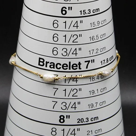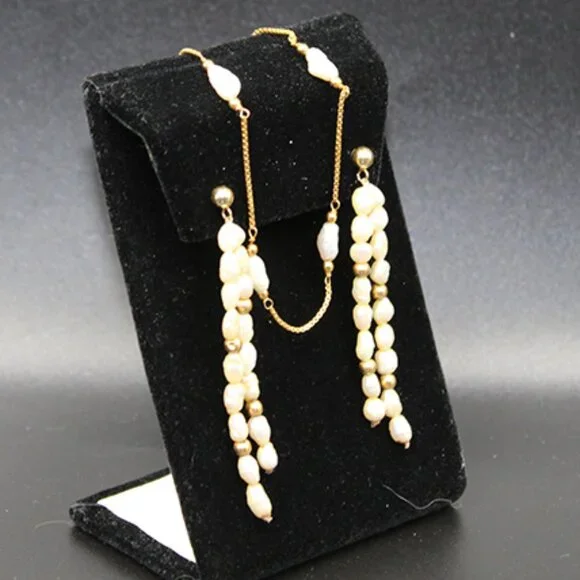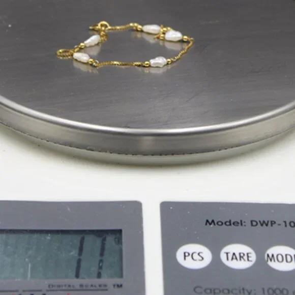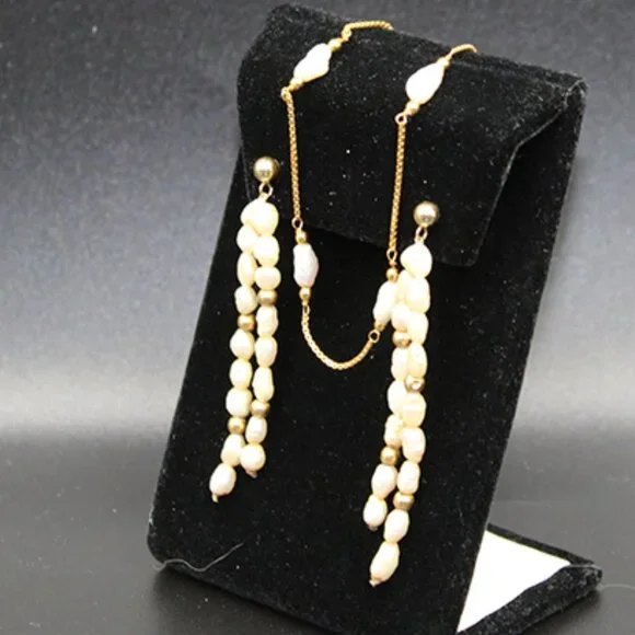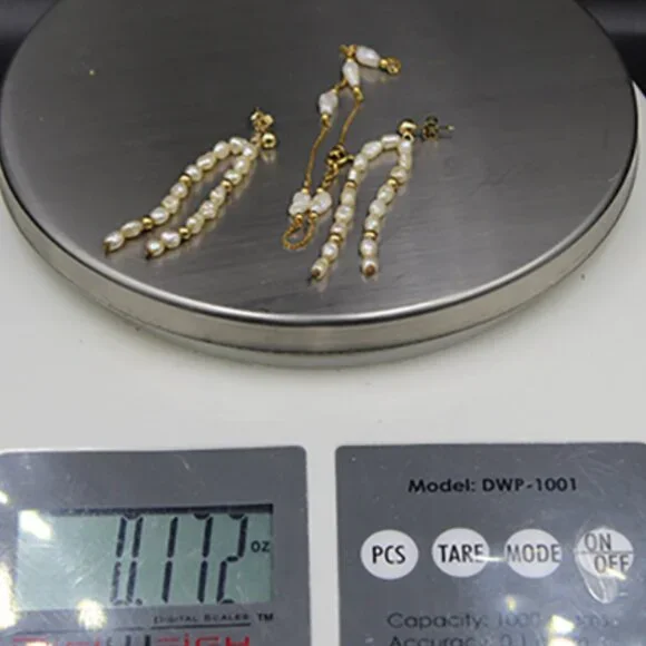 Here is a NWT 14K gold beads and natural freshwater pearl station bracelet with a 14K gold beads and natural freshwater pearl dangle drop earrings. This is a matching jewelry set. The MSRP listed price is $650. This jewelry set is on sale in mystore during this holiday season.Each earring consists of 2 dangle/drop strands of freshwater pearls and 14K gold beads. The longer strand is approximately 2 inches in length. Each earring has a 3.18 mm (1/8 in) 14K yellow gold stud bead with 14K yellow gold post and snap clasp. The clasp is marked "14K" and "Italy". The earrings gram weight is is listed as 3.2 grams.The bracelet consists of 5 pearl and 14K yellow gold beads stations. Between each station is 14K yellow gold box chain. The bracelet closure is 14K yellow gold spring ring clasp and tag. The tag is marked "14K" and "Italy". The bracelet gram weight is listed as 1.7 grams.The approximate length of the bracelet is 7.25 inches.The approximate length of each earring is 2 inches.The combined earrings and bracelet gram weight is listed as 4.9 grams.Please refer to the pictures concerning the description and condition of this item.The bracelet and earrings were tested to be 14K using a Presidium Gold Tester.