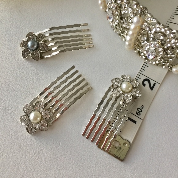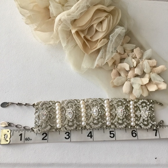 Bridal Jewelry BraceletWorn once, pristine condition From Regina B New York bridal accessory designerHer bridal designs are inspired by opulence of vintage jewelry, incorporating Swarovski crystals and fresh water pearls.Color plating used:Rhodium - light silver Antique Rhodium - darker silver colorThe pink hue is a reflection of my shirt, not a flawThis listing is for the bracelet onlyBundle set of 3 Swarovski w/ pearl hair pins for $350Bracelet comes w/ original box as seen on photo
