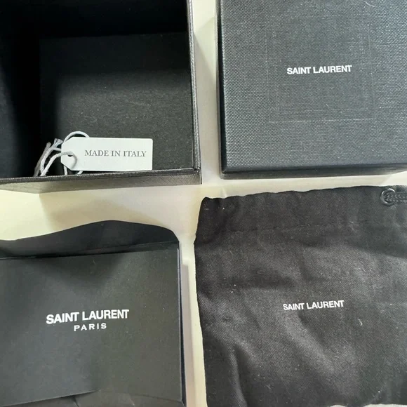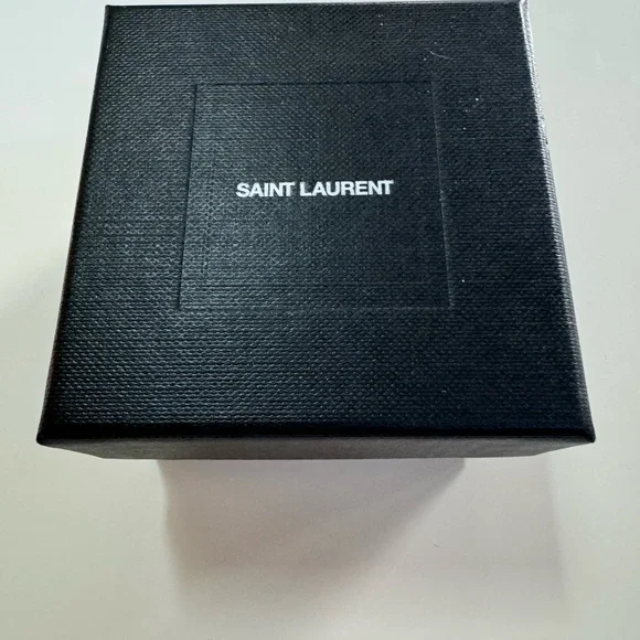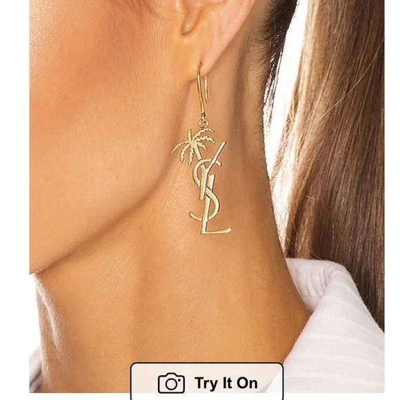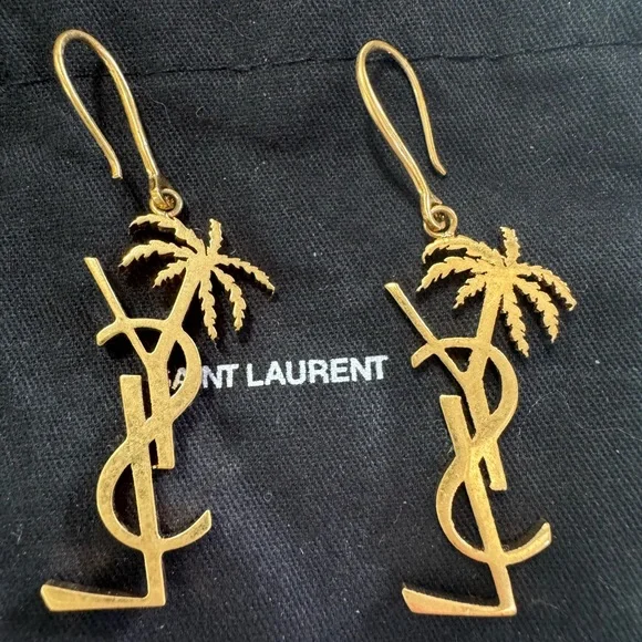 Elegant gold earrings featuring the iconic Saint Laurent logo with palm tree design.
