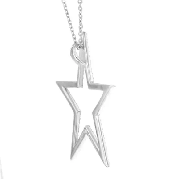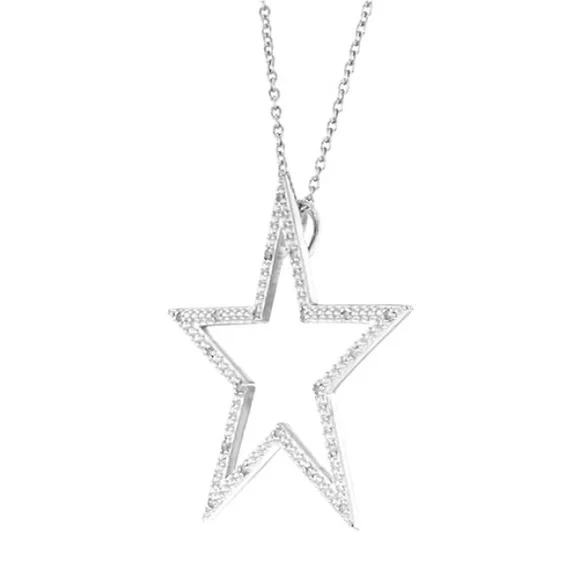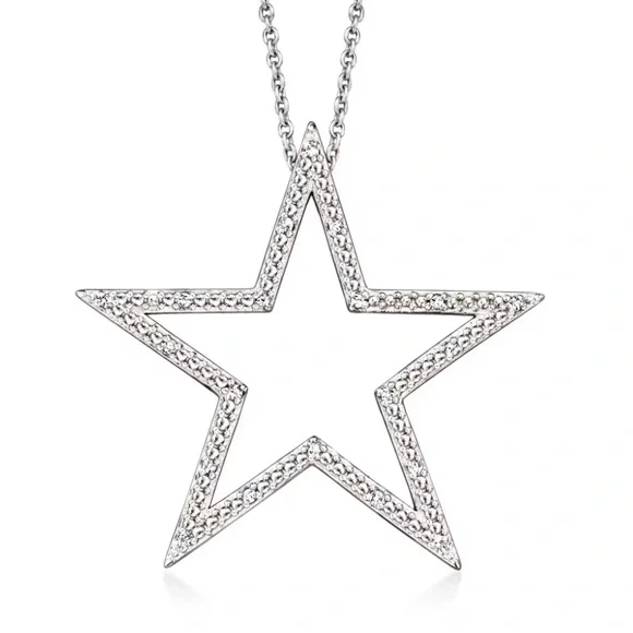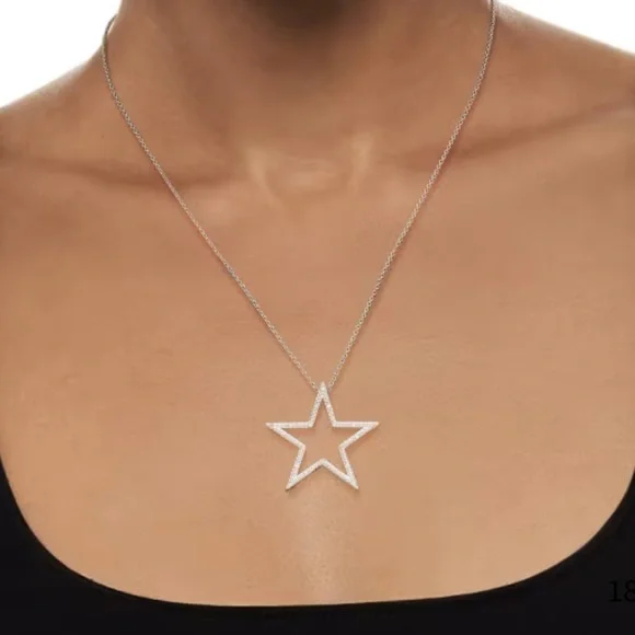 Made in solid 925 sterling silver with 20 diamonds all around the star.The necklace is 18” longThe star is 1.25” long verticallyMarked 925Authentic natural diamonds