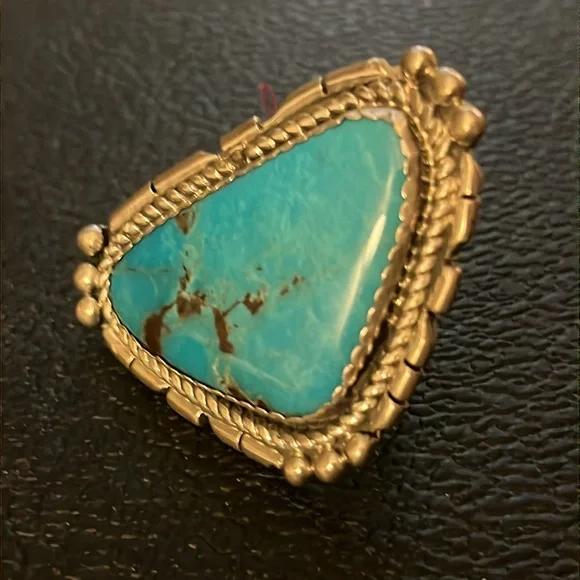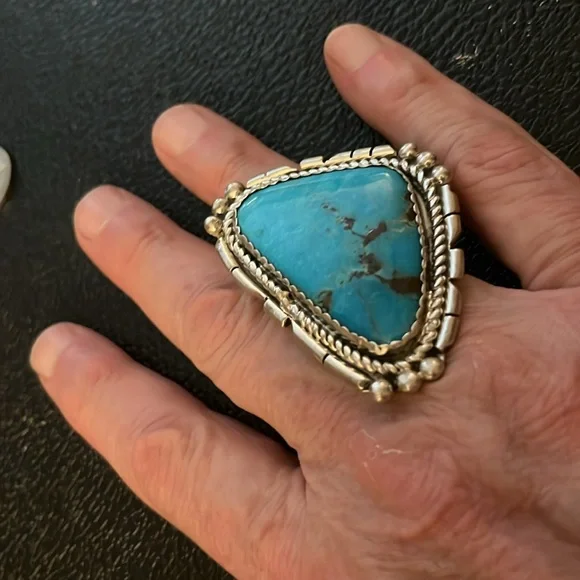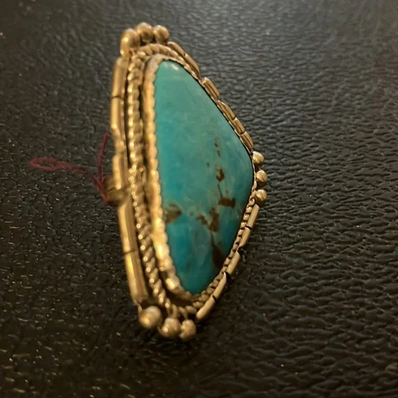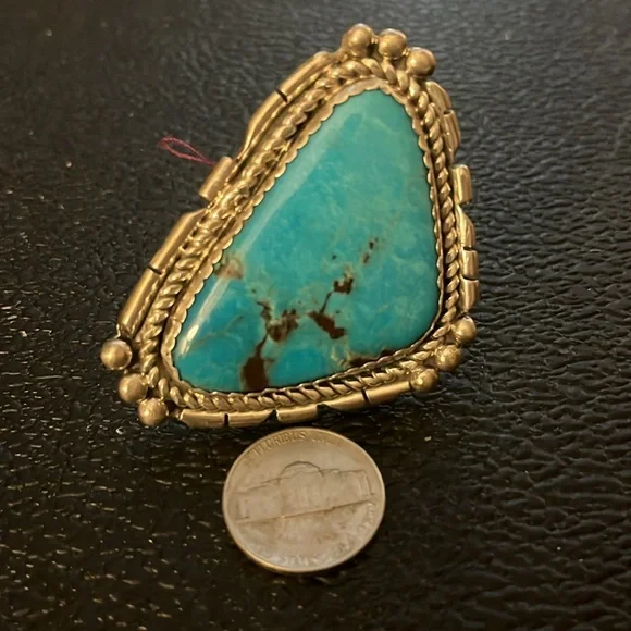 Elevate your style with this stunning turquoise and sterling silver statement ring. Perfect for adding a pop of color to any outfit.