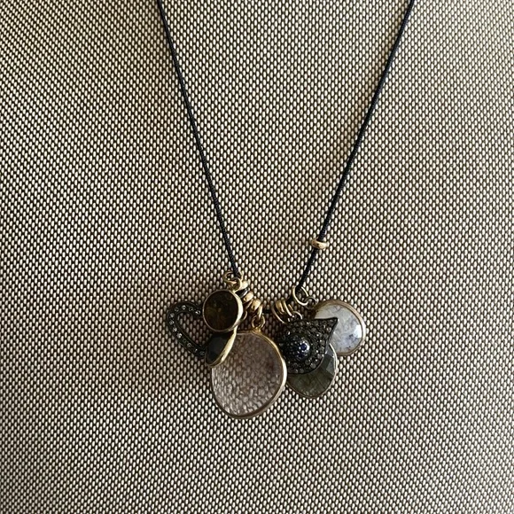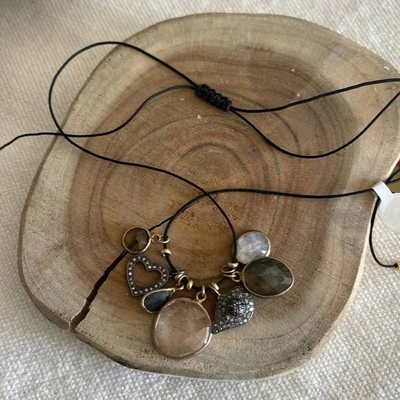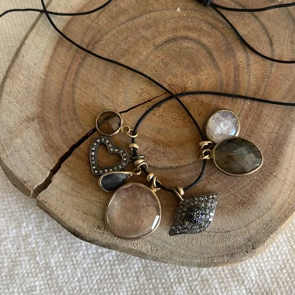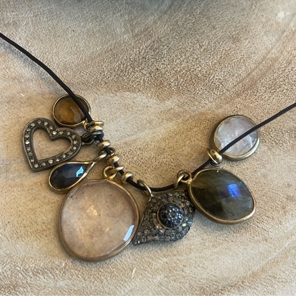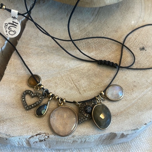 Black cord adjustable with gold fill beads and gemstones and 2 diamond pave charms One of a kind necklace New with tags 375$ Charms are moonstones, labradorite , smoky topaz , and...