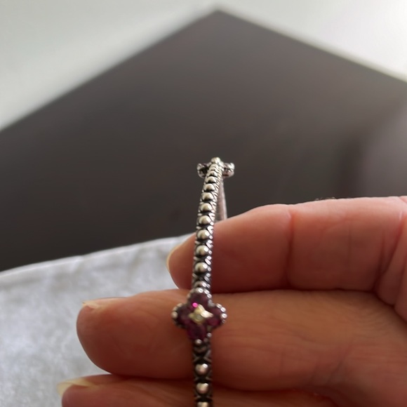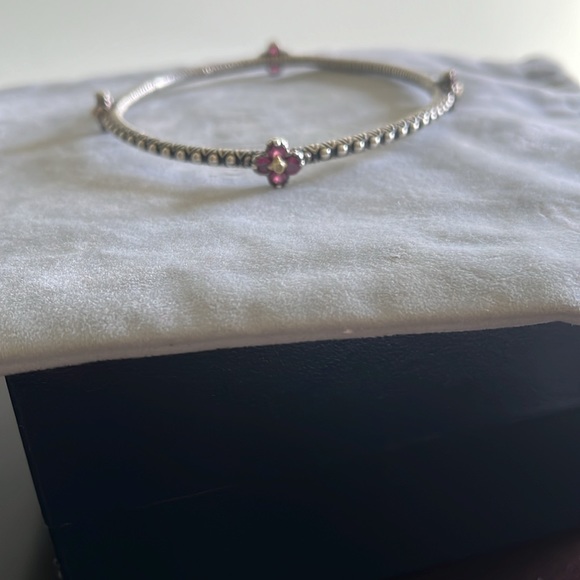 This radiant bangle is decorated with four stations of round, prong set gemstones in a floral design. Each flower has 18k yellow gold center accented with white topaz. Beaded and zigzag motifs complete the gleaming design. From Barbara Bixby. Sterling silver and 18k gold. The four stations of flowers are pink garnet. Approximately 2 carats. Fits average wrist.