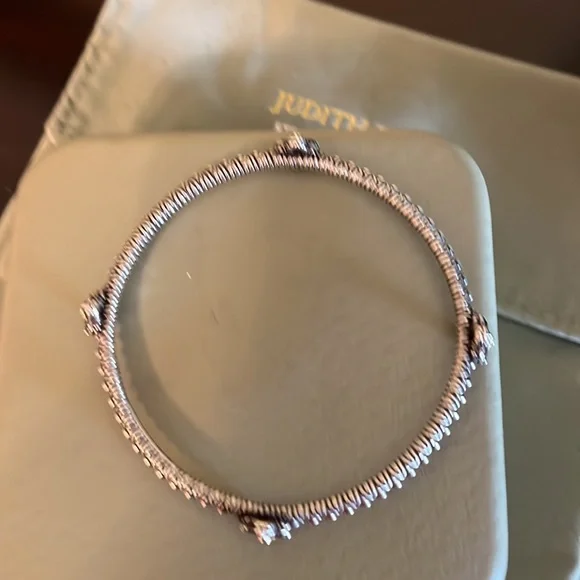 This radiant bangle is decorated with four stations of round, prong set gemstones in a floral design. Each flower has 18k yellow gold center accented with white topaz. Beaded and...