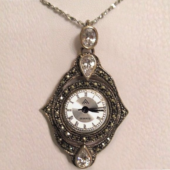 I had a jewelry store that just closed down, so I have a lot of beautiful pieces for sale, which I am blowing out for 35%-50% off wholesale!!All metals and stones are genuine.This is a unique, vintage, estate piece (with small, minor flaws from age). Round quartz watch center, surrounded by a beautiful genuine marcasite & crystal stones design, all set into sterling silver. Measures 2.25" Long (including top bail) X 1.25" AcrossCan come on a 16" or 18" matching antiqued sterling chain. This would also look great hanging on your own black suede choker. PRICE IS FIRM!!