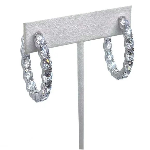 I´m a designer for one of the nation´s top jewelry brands when it comes to celebrity jewelry. Borrowed Bling has been supplying jewelry to the TV industry for 20+ years and has been featured in Marie Claire, Newsweek, Good Housekeeping, Cosmo Italia, The Wall Street Journal, etc. They have also been seen on E News, The Tyra Banks talk show, KTLA News, The Today in New York show, etc. They are known for their simulated "diamonds", which look SO visually identical to naturally grown diamonds that they can even fool many jewelers - So they DEFINITELY look real enough to fool your friends!These are as close to real as you´re ever going to get for under $300!Their $295 wholesale price is being marked up in stores to over $649, so prices here are FINAL & FIRM!I am FINALLY allowed to sell some of their top selling designs here on PM.These come in round OR oval shape - Your choice after purchasing!DETAILS:Prong-set with 14 round stones (4.75mm / just under 1/2 carat each) for 11.2 carats total / Hoop measures 1.25" in size / 12 grams of silver that has been sealed in rhodium-platinum so they won´t tarnish.Huggie style so they go all the way around and the post clips into a patented SECURITY lock in the back of the lobe so they can not open or come off until you depress a little lever in back. Stones along the front and inside back of hoop.For video of OVALS: https://shop.borrowedbling.com/product/hoop16-missed/ Comes with a 6 month free stone repair warranty.