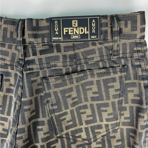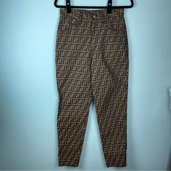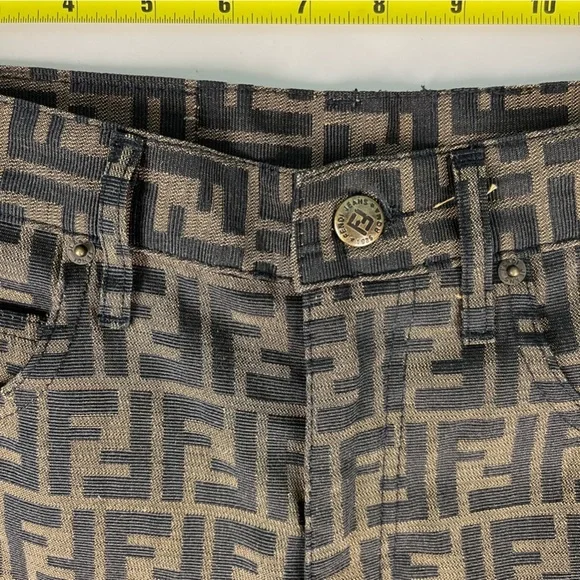 Brown cotton blend Fendi Zucca pattern long pants from Fendi Pre-Owned featuring a high rise, a waistband with belt loops, a button and zip fly, a five pocket design, a leather...