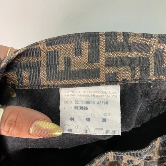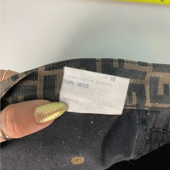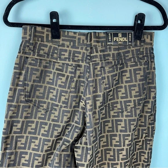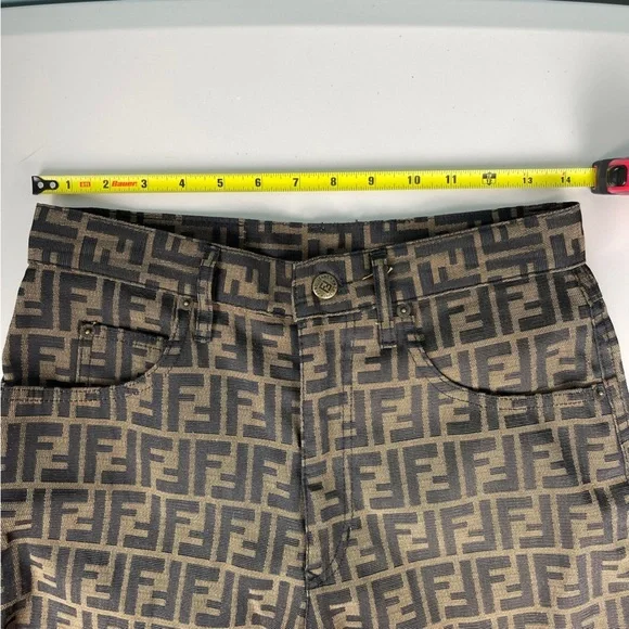 Brown cotton blend Fendi Zucca pattern long pants from Fendi Pre-Owned featuring a high rise, a waistband with belt loops, a button and zip fly, a five pocket design, a leather brand patch to the rear, a straight leg, a cropped length and a monogram pattern. Please be mindful that this piece has led a previous life, and may tell its story through minor imperfection. Purchasing this item continues its narrative, so you can be confident that you’re making a POSITIVELY CONSCIOUS choice for the planet.Made in ItalyCompositionPolyester 70%, Cotton 30%
