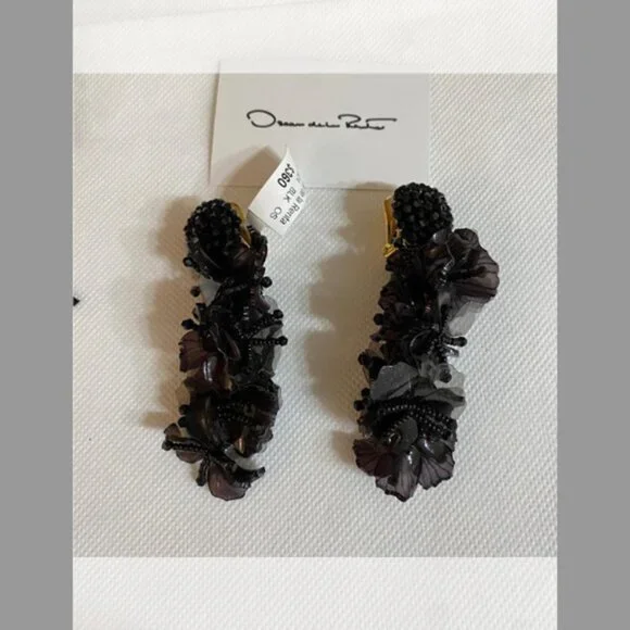 THESE AUTHENTIC NWT EARRINGS OSCAR DE LA RENTA EARRINGS RETAIL FOR $360.00 PLUS TAX IN MOST UPSCALE DEPARTMENT STORESTHESE EARRINGS ARE KEPT IN A SMOKE AND PET FREE ENVIRONMENTOscar de la Renta earringsAcrylic, PVC, and glass beadsClip-on backs with comfort padsSpot cleanImporteditem no. 0000130000color black