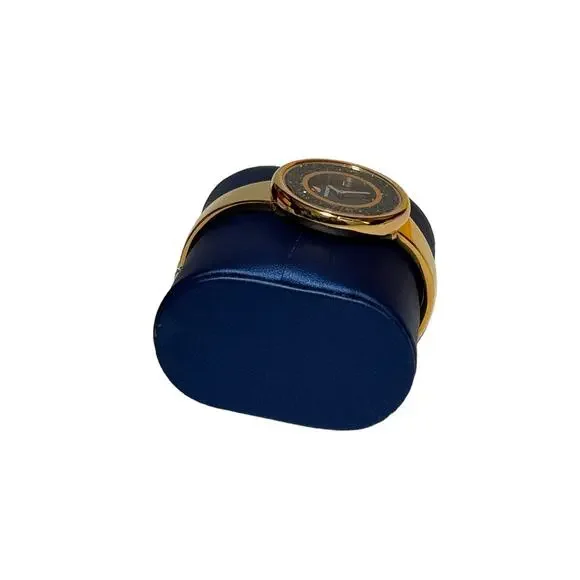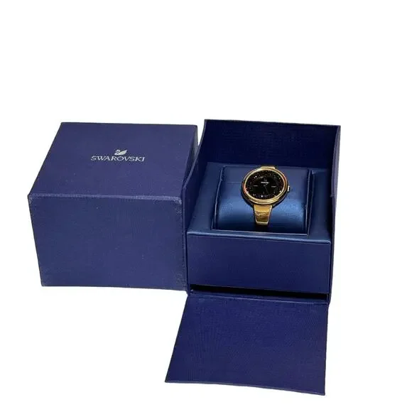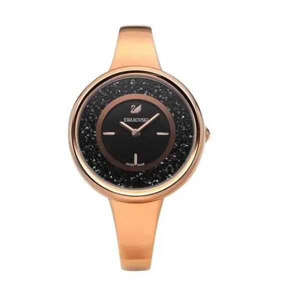 Swarovski Crystalline Pure Quartz Black Dial Ladies WatchDescription:Please note no outer box.Rose gold PVD metal case and bracelet. Fixed rose gold PVD bezel with a black crystalline inlay. Black dial with rose gold-tone hands. Index markers appear at the 3, 6 and 9 o´clock positions. The Swarovski Swan logo appears at the 12 o´clock position. Dial Type: Analog. Quartz movement. Scratch resistant mineral crystal. Pull / push crown. Solid case back. Round case shape. Case size: 34 mm. Case thickness: 7 mm. Band width: 14 mm. Jewelry clasp. Water resistant at 50 meters / 165 feet. Functions: hour, minute. Additional Info: case filled with 850 crystals. Dress watch style. Watch label: Swiss Made. Swarovski Crystalline Pure Quartz Black Dial Ladies Watch 5295334
