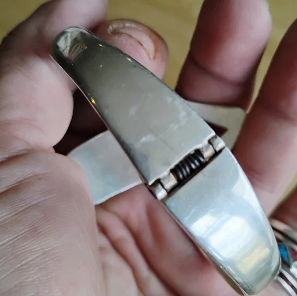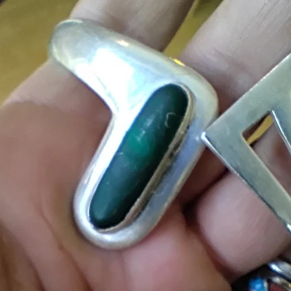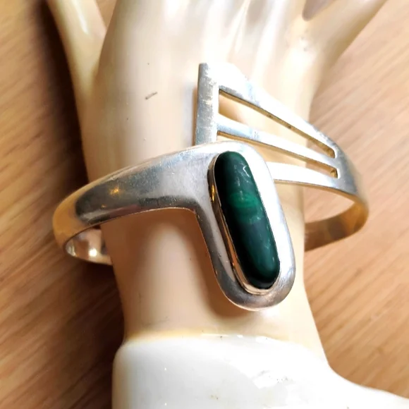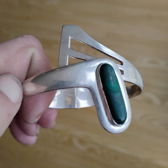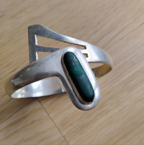 Taxco Sterling Modernist Clamper Bracelet Hinged Cuff Jade Stone MCM brutalist Vtg CDC TD-27 Taxco Mexico 950 Sterling Silver Bangle Bracelet. Signed hinged bangle bracelet....