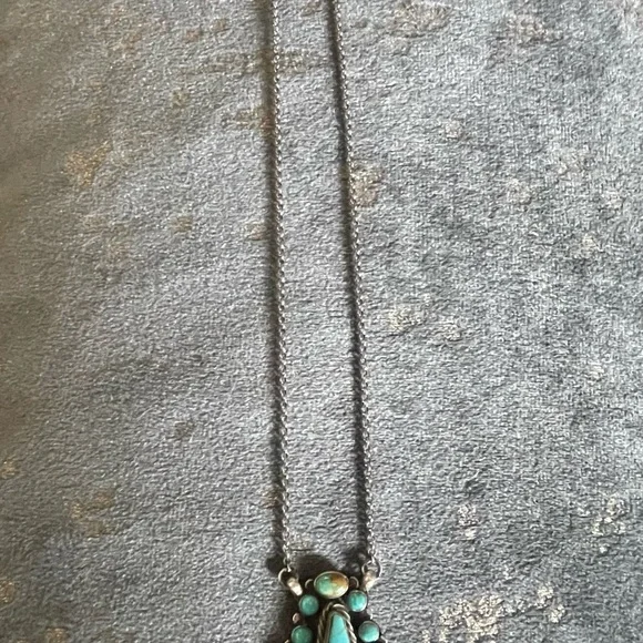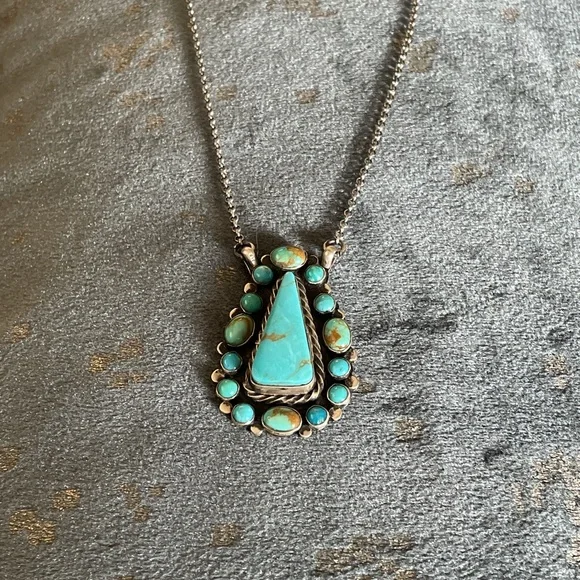 Gorgeous Sterling Silver Kingman Turquoise Necklace Handcrafted by Donovan Skeets. Truly one of a kind!15 hand placed stones and exceptional sterling detail.Necklace is 16” Stamped 925 and artist hallmarked