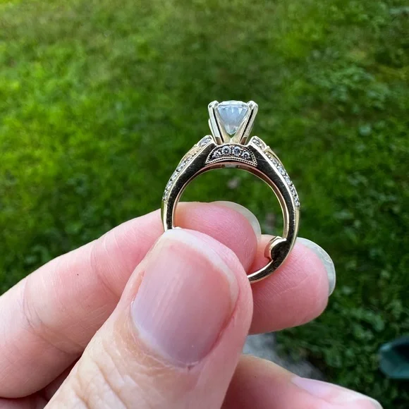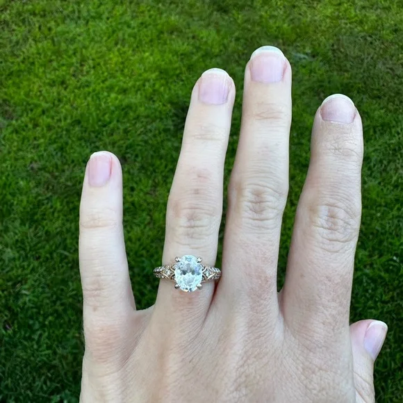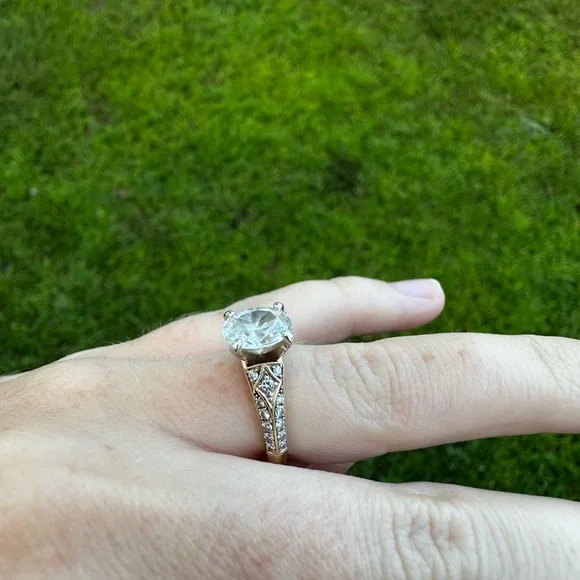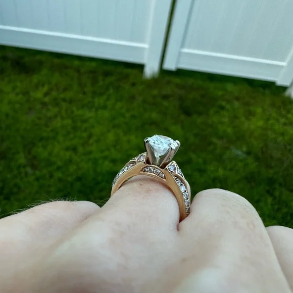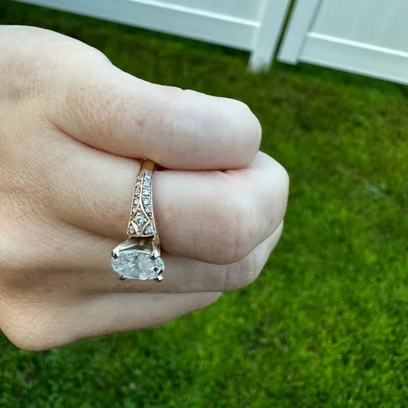 Please read the whole description!! This was a custom ring made by a local jeweler, who I worked for at the time of making this ring. 14k Yellow Gold Center stone is a cubic zirconia 1.5 ct oval Side diamonds are real diamondsSized to a 3 but can be sized up Jeweler beadsare on the inside of the shank prevent the ring from spinning but those can be removed. The head (prongs) that holds the center stone can be removed to for any shape diamond. The plan was to pick out my own diamond after the ring was made. It just never went that far. I only wore this a few months. No signs of wear The custom ring was originally $1,500