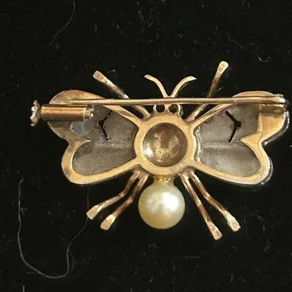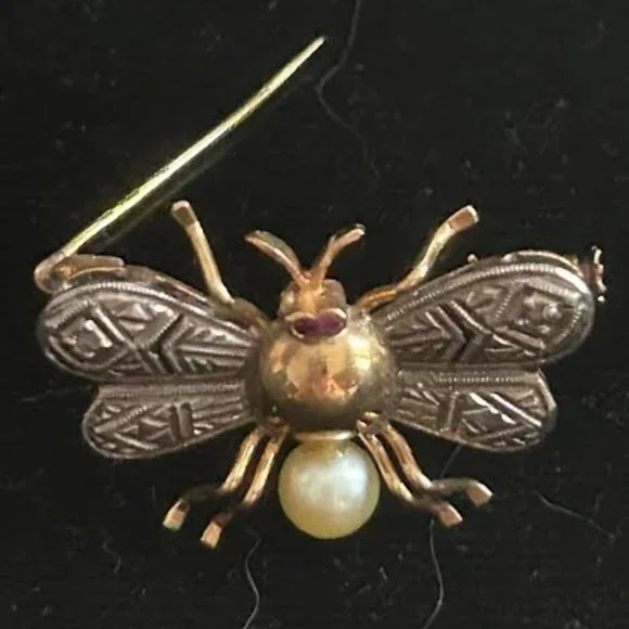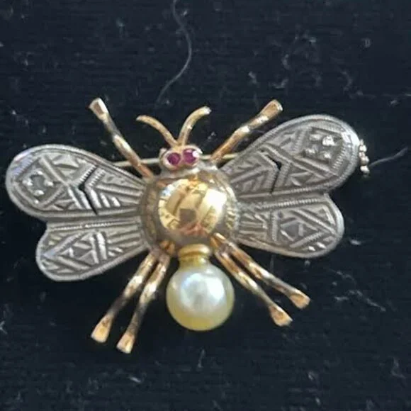 Classic Edwardian bug brooch having a cultured pearl, diamonds, and ruby eyes, set in a silver and 18K gold body. This little bug has six gold legs, a pair of ruby eyes, diamonds encrusted on its silver wings, a gold thorax and cultured pearl abdomen. Inspired by spring and summer bugs, this bug will perch nicely on one’s décolletage, scarf or lapel. Great find for a collector.The Edwardian era in jewelry lasted from 1901 to 1915, and was named after King Edward VII of England.LOOKhttps://antiqueresourcesinc.com/product/edwardian-insect-brooch/