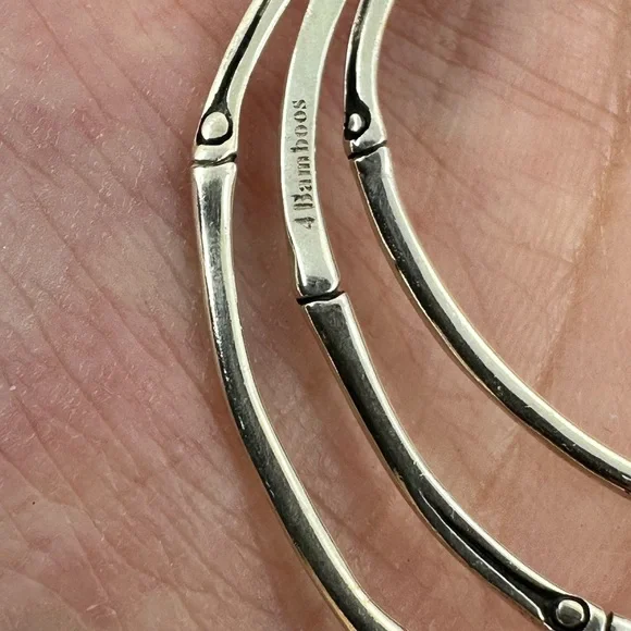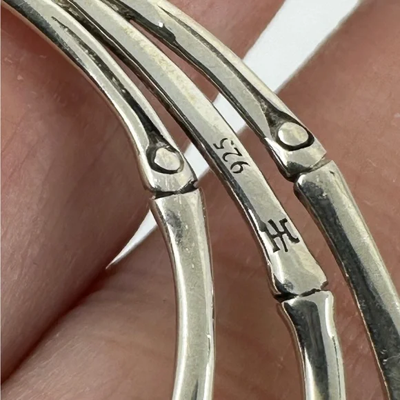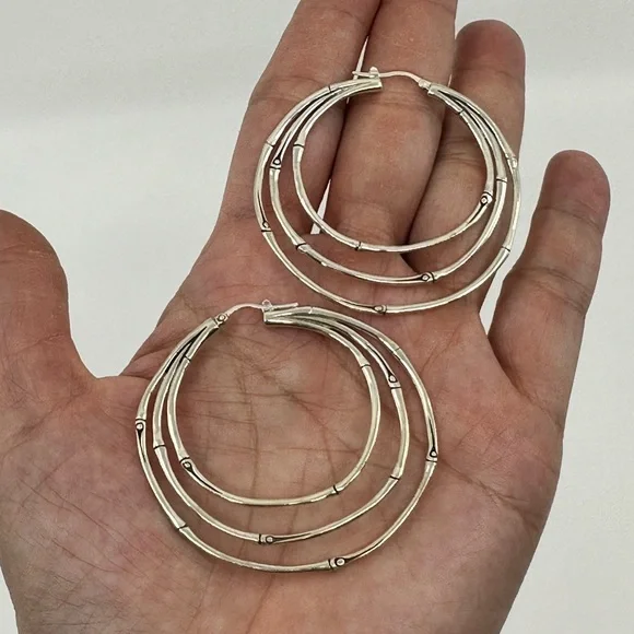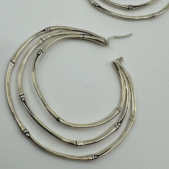 John Hardy Sterling Silver 925 Triple Bamboo Hoop Earrings2" HStamped JH (logo), 925, 4 BamboosComes with unopened polishing cloth/cardNote: It´s a bit tricky to lock the backings. You´ll need to ensure the backing snaps into the clasp. You should hear/feel a click. Classic Boho Bamboo Sterling Silver 925 Designer Luxury Casual Minimalist Circles Circular Abstract