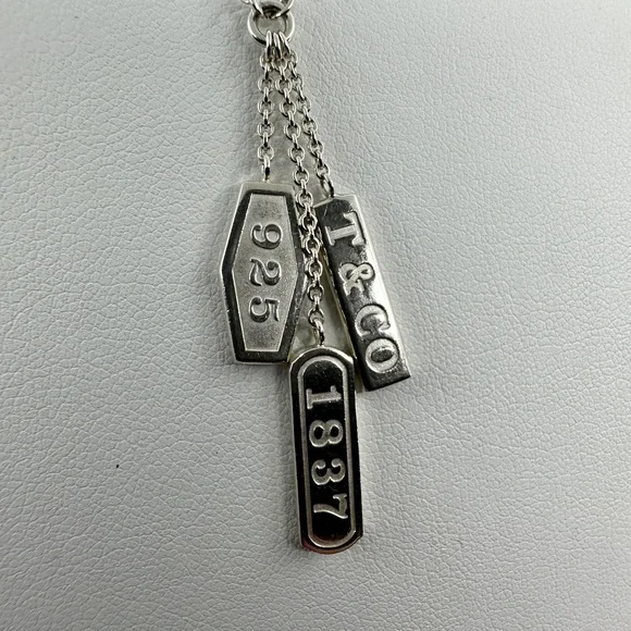 Tiffany & Co. 1837 Sterling Silver Necklace 16" chainThree dangle bar charms: T&Co., 1837 & 925Chain is stamped 925 Italy / Tiffany & CoCharm is stamped Tiffany & Co. 925...