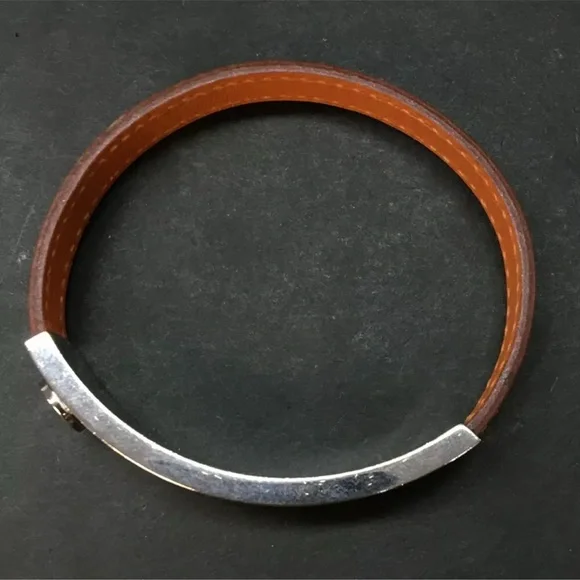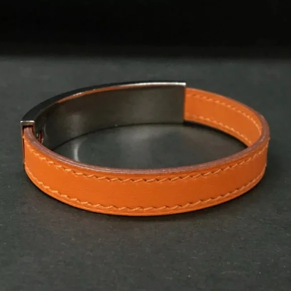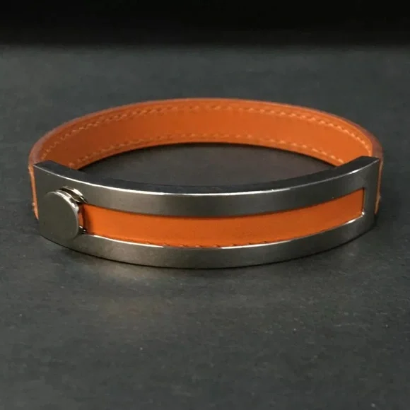 Stylish bracelet with orange leather and silver metal accents. Perfect for any occasion.