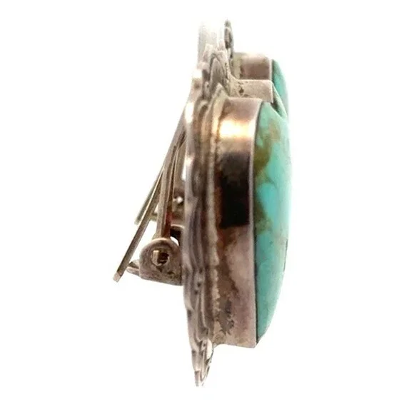 * Native American 925 Sterling Silver Turquoise Heart Concho Clip On Stud Earrings * Length: 1-1/8"* Width: 1-2/8"* Weight: 17.2 tgw* Each turquoise stones measures approximately 20.50 mm* Marked: 925* Condition: As pictured.* S7549